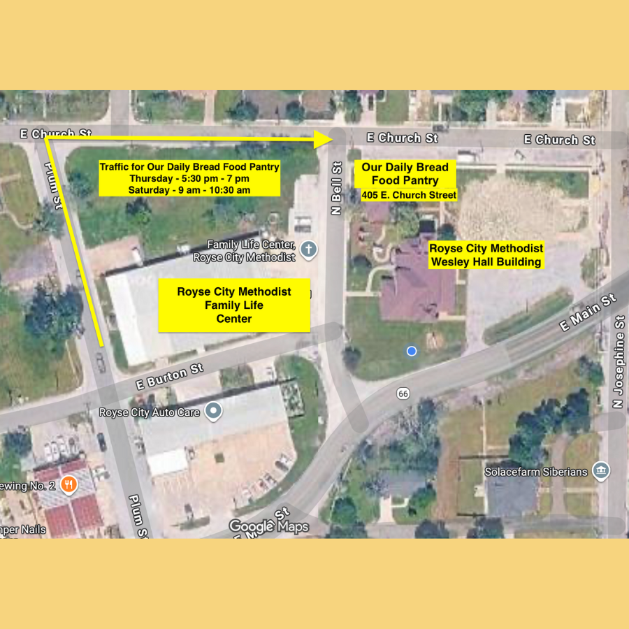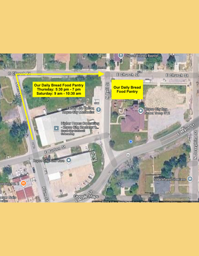 Our Daily Bread is our on-site food pantry that provides assistance to local residents within the Royse City Independent School District boundaries, Nevada, Josephine, and Caddo Mills. Visit us at 405 Church Street in Royse City on Thursdays from 5:30-7:00 pm and Saturdays from 9:00-10:30 am.